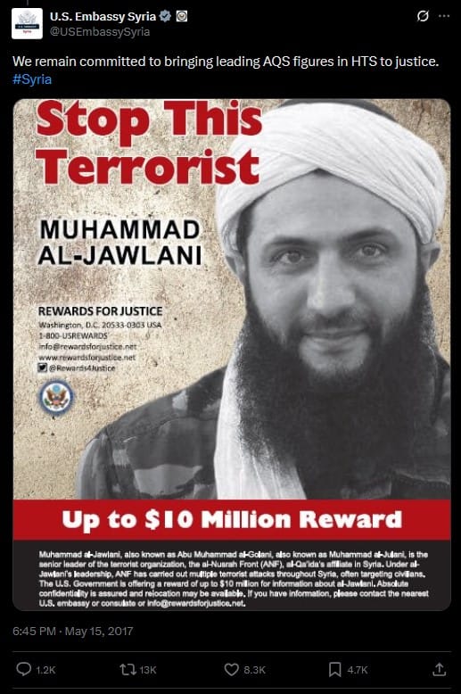 El Kaide’nin Suriye uzantısına bağlı olduğu belirtilen “terörist” Colani’nin başına ödül konulan ilan halen paylaşımda. (ABD Suriye Elçiliği)